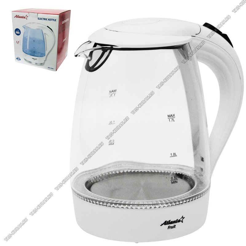 Объем 1,7 литра; Корпус из термостойкого стекла; Иллюминация; Специальная ручка от скольжения; Поворот на подставке на 360°; Быстрое закипание; Фильтр от накипи; Закрытый нагревательный элемент; Автоматическое отключение; Защита от перегрева без водыыыыы; Электрошнур в цокольной подставке, 70 см; Номинальная мощность 1850-2200 Вт220-240 B ~ 50/60 Гц