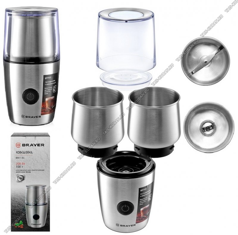 Кофемолка 200Вт 100г +Капучинатор 20Вт 140мл,таймер,нерж.сталь,серебро (6)