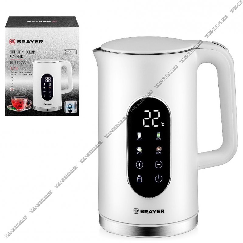 Чайник пластик+нерж. 1,7л 2200Вт 2-ная стенка (внутр.нержсталь) диск,сенсорн.упр,цифров.диспл,реж.кипяч.(40-100°С),поддерж.t,автооткл,защ.б/воды,белый (8)