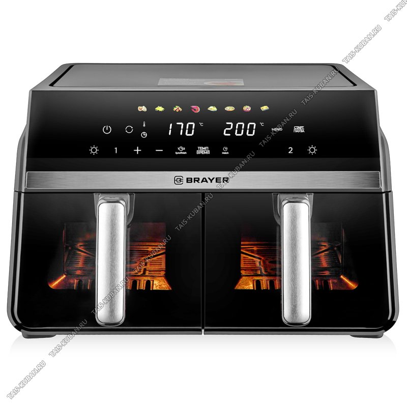 Мощность 2200 Вт,Объем 10 лОбъем каждой чаши 5 лИндивидуальная настройка программ для каждой чаши8 программ: мясо, фри, голень, морепродукты, рыба, пицца, кекс, сушкаКорпус из высокопрочного термостойкого пластикаФункция «Match» - копирование параметров приготовления на вторую чашуФункция «SyncFinish» - синхронизация времени окончания приготовления в обеих чашахФункция подогрева пищиСенсорное управлениеLED-дисплейРегулировка температуры 30–200 °СТаймер до 24 часов