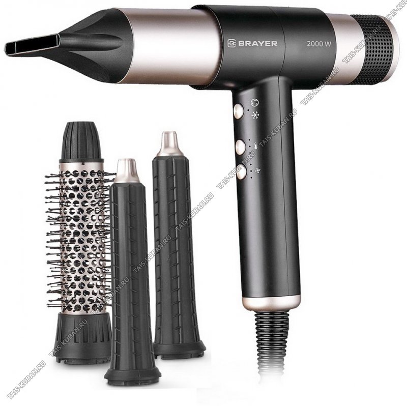 3t режима,3скорости,холодный воздух,4насадки-концентратор,круглая щетка d3,2см,2 цилиндрические насадки для локонов,световой индикатор,съемный фильтр,блокировка от случайного нажатия,автоочистка,вращающийся шнур 3м,цвет черный/бронзоый,Brayer