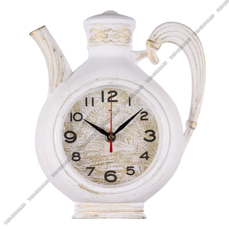 Часы (пластик) фигурные (26х24см) "Чайник" белый с золотом