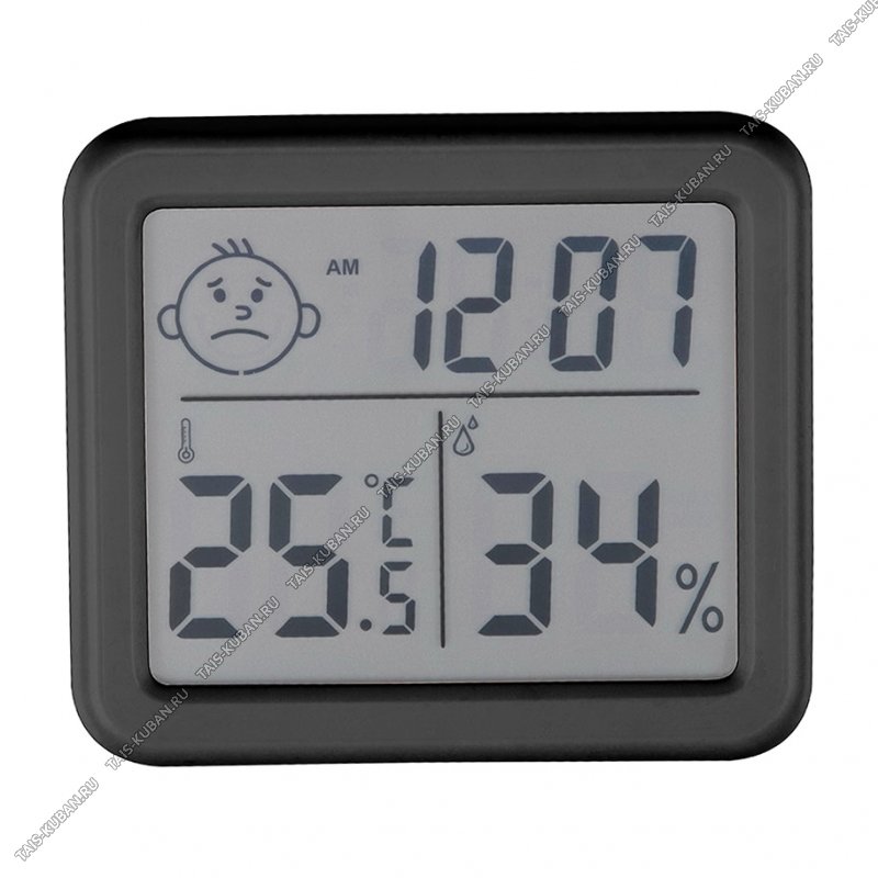 Термометр-гигрометр 3в1(t в помещ/влажность,часы) 7х6,5см, черный (48)