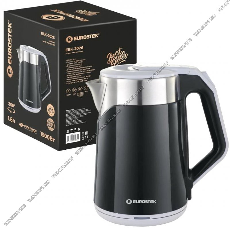 Чайник электрический «Eurostek» EEK-2026, 1500 Вт, Объем 1.8 л , Двойной корпус из нержавеющей стали и пластика, кнопка открывания крышки, шкала уровня воды, дисковый нагревательный элемент, световая индикация работы, вращения чайника на подставке наааа 360, автоматическое отключение при закипании и при недостаточном количестве воды.