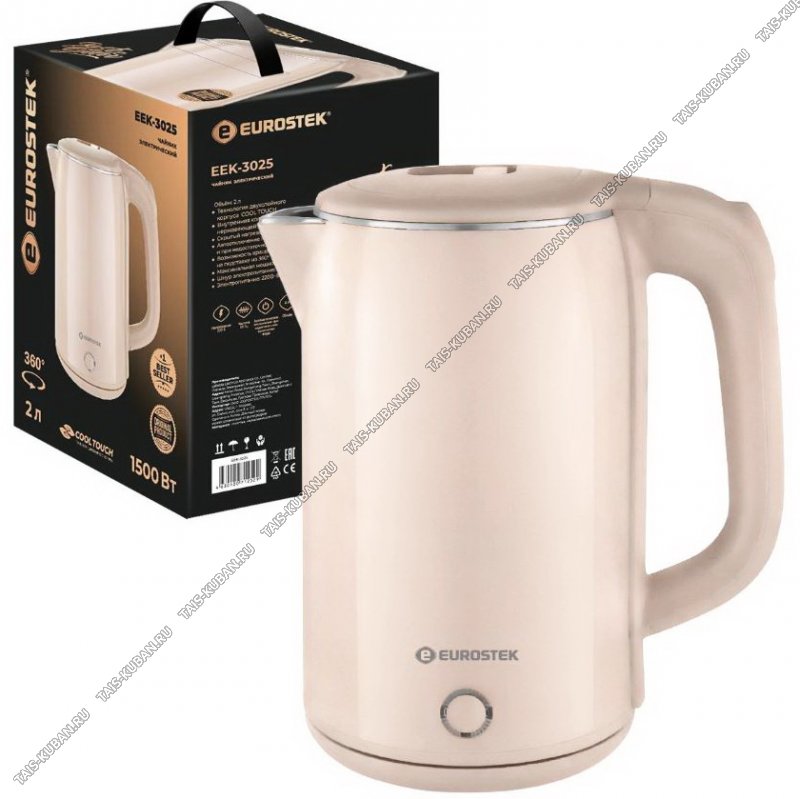 Чайник электрический «Eurostek» EEK-3025, 1500 Вт, Объем 2,0 л , Двойной корпус из нержавеющей стали и пластика, кнопка открывания крышки, шкала уровня воды, дисковый нагревательный элемент, световая индикация работы, вращения чайника на подставке наааа 360, автоматическое отключение при закипании и при недостаточном количестве воды.