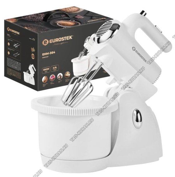 Миксер ручной Eurostek EHM-364. Мощность 350 Вт, 5 скоростей, объем вращающейся пластиковой чаши 2.5 л., насадки для замешивания теста, насадки для взбивания, эргономичный дизайн.