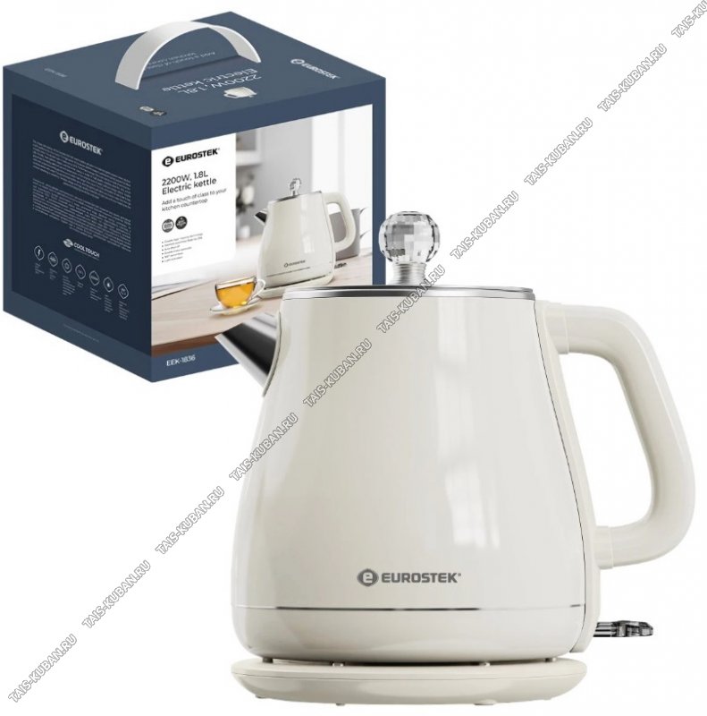 Электрический чайник Eurostek EEK-1836Объем 1,8 л , мощность: 2200 Вт, технология двухслойного корпуса COOL TOUCH, дисковый нагревательный элемент, длина шнура 0,9 м, световая индикация работы, вращения чайника на подставке на 360, автоматическое ооооооотключение при закипании и при недостаточном количестве воды.