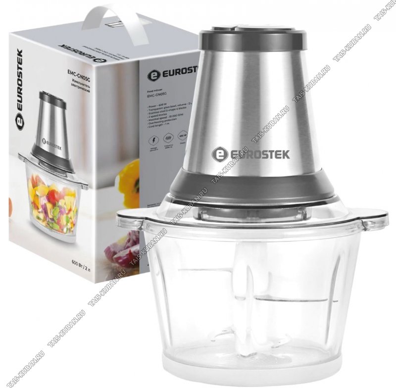 Измельчитель электрический Eurostek EMC-GN05GМаксимальная мощность – 600 Вт Толстая и прочная стеклянная чаша для измельченияОбъем чаши 2,0 л. Стальной двойной нож из 4 лезвий.2 скорости. Скорость вращения ножа – 35 000 оборотов в минуту.Мееедный мотор. Длина шнура – 1 м