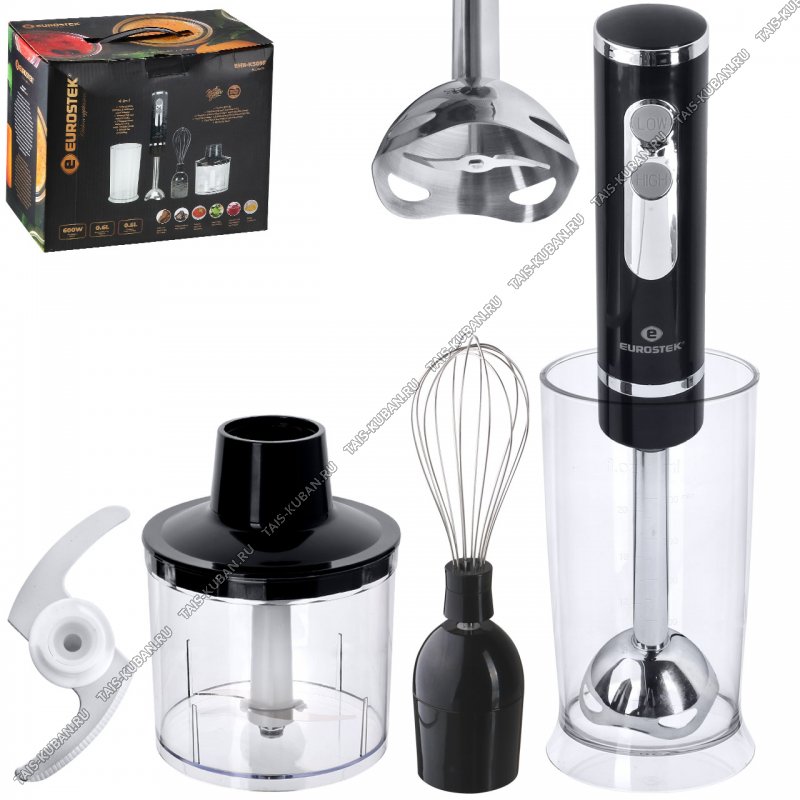 Блендер погружной Eurostek EHB-KS09FМаксимальная мощность: 600 ВТ, 2 скорости, объем измельчителя: 500 мл. Материал чаши - пластик, Материал венчика, погружного блендера с лезвием - нержавеющая сталь; объем мерного стакана: 600 мл, корпус из прочнннного пластика. защитный замок; цвет черный