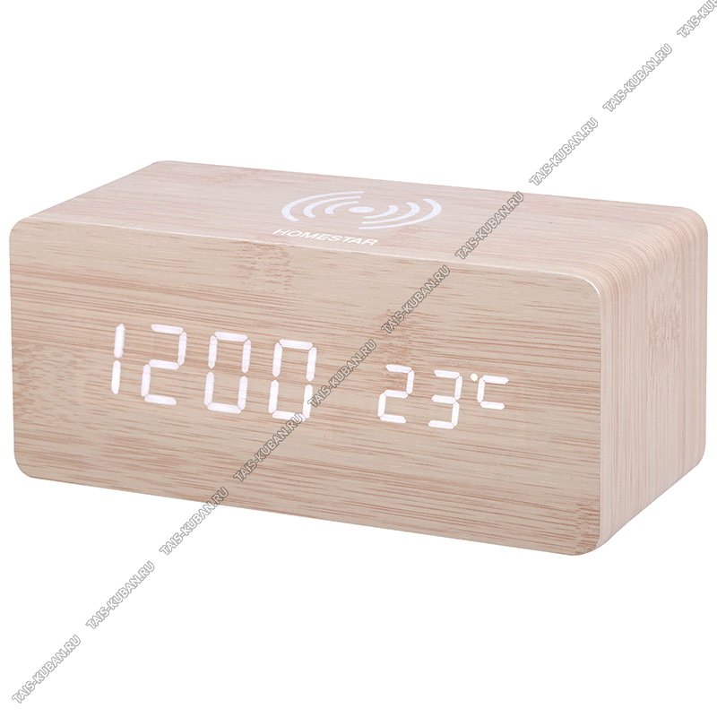 3 будильника, дата, показатель температуры по Фаренгейту и Цельсию, 2 режима отображения, 3 уровня яркости, функция памяти, корпус - дерево, беспроводная зарядка, работа от батареек ААА 4шт (не входят в комплект), подарочная упаковка (40)