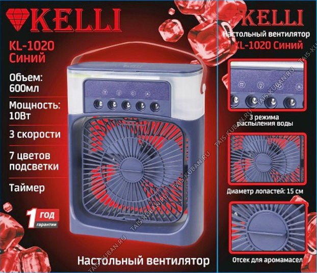Вентилятор настольн.KELLY с функцией увлажнения 10Вт,dлопастей 15см,3скорости,д/воды 0,6л,3режима распыления,отсек д/аромамасел,подсветка 7цвет,регулировка наклона,таймер,20х26см,раб.от USB (в комп-те),ремень д/переноса,подарочн.упаковка,синий (24)