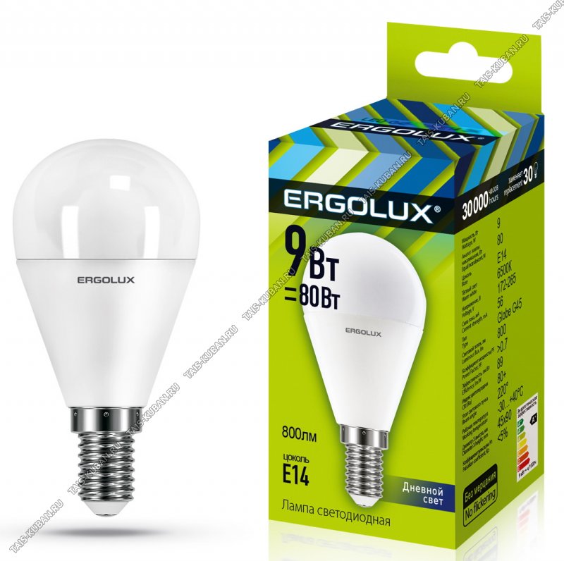 Ergolux-Шар E14 9Вт,дневн.6500К,светов.поток 800Лм (аналог 80Вт обыч.лампы) h92мм d45мм.(10)