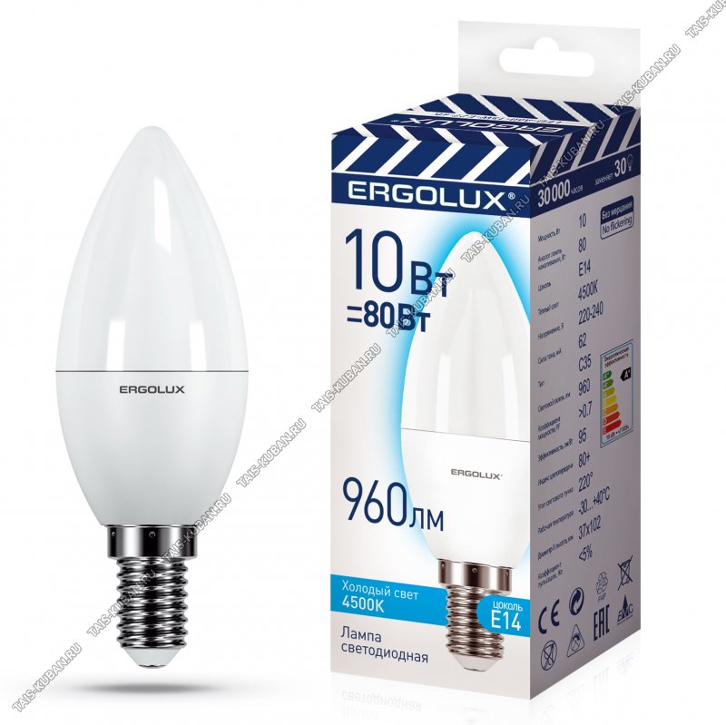 Ergolux ПРОМО-Свеча E14 10Вт,холодн.4500К,светов.поток 960Лм (аналог 80Вт обыч.лампы) h102 d37мм (10)