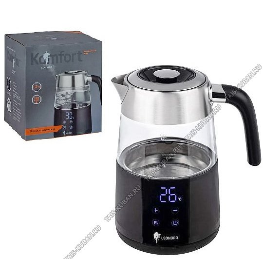 Чайник пластик+стекло 1,7л 2200Вт диск,LED дисплей,сенсорн.управ,ф-ия памяти,регул.t,4реж,поддерж.t,автооткл,защ.б/воды,черный (6)