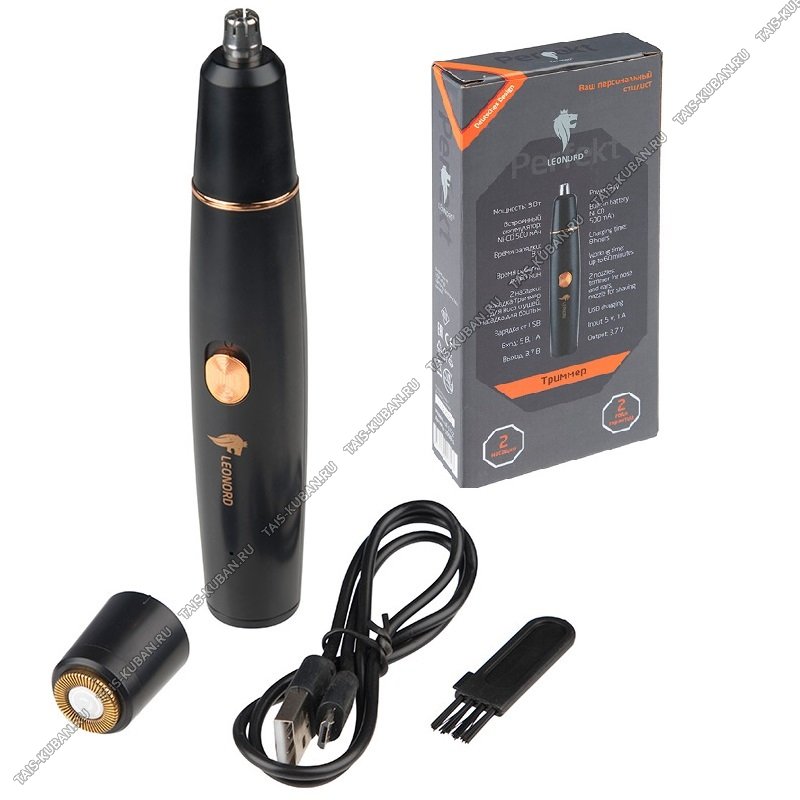 Триммер д/носа,ушей и бровей (акум) 3Вт,насад.д/бритья, в комп. USB-шнур, щетка д/очист, черный/золото (120)