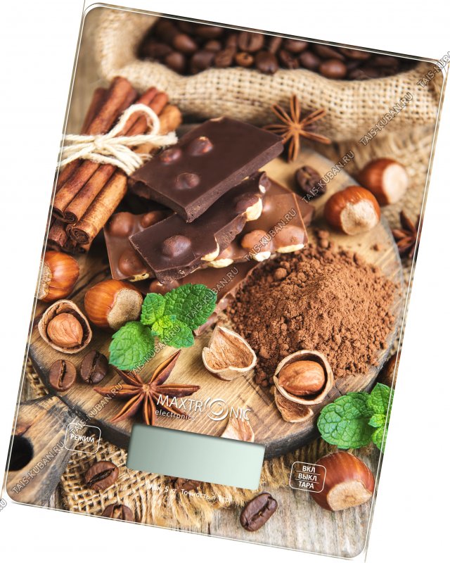 Весы кухонные электронные (стекло) до 5кг "Шоколад с корицей" прямоугольные (14,5х20см) деление 1 грамм, сенсорное управление, автоотключение, функция тара, питание 2*ААА (24)