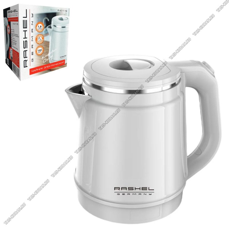 Чайник пластик+нержавеющая сталь 1,8л 1500Вт, диск, 2-ная стенка (внутр-нержавеющая сталь),автоотключение, вращающийся корпус на 360°,защ.б/воды, белый (6)