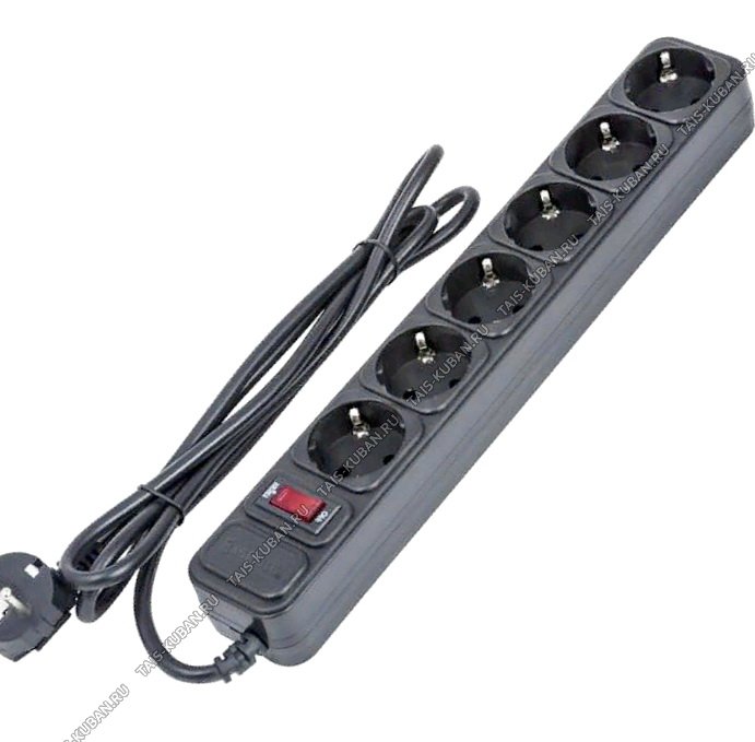 Сетевой фильтр "ДИП" (с выключат) цв.черн 6 гнезд, L5м,ПВС сеч.3х0.75 ,10А,6.0кВт,с з/з евростандарт 250В (20)