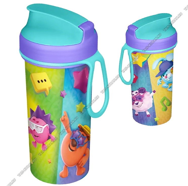 Стакан 0,4л д/холодных напитков "Смешарики" сиреневый (d7 h16см) откидная крышка,с петлёй, Бытпласт (12)