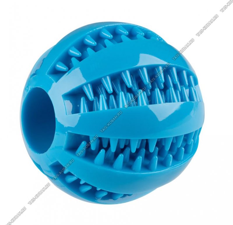 матреиал: резина, цвет синий. Игрушка для активных игр с питомцем, безопасна для животных и подойдёт для любых пород и размеров. Мяч не имеет мелких деталей и легко отгрызаемых частичек. Форма мяча массирует десны и очищает зубы. Внутри мяча можно раааазместить корм.