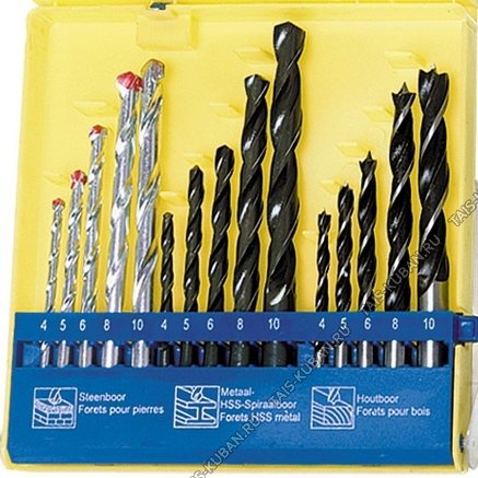 Сверла комб. н-р 15шт.(4,5,6,8,10мм-по бетону,мет,дер) цил.хвостовик,пласт.пенал