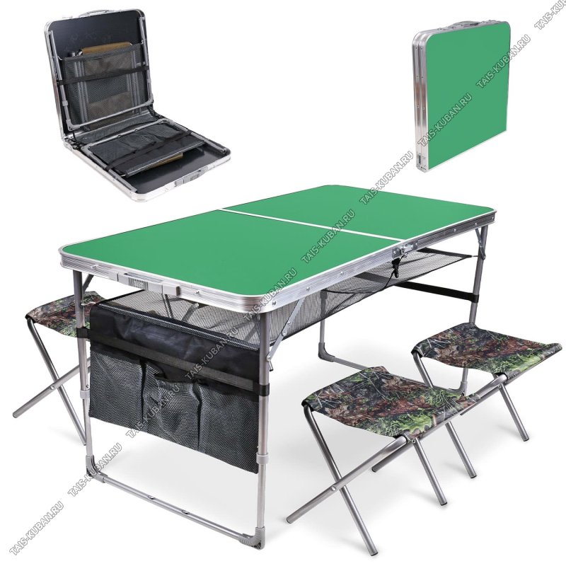 складной (стол регулировка высоты44/61см, навесн.полка, боковой каран, водостойкий пластик, алюминиевый профиль, нагрузка до 20кг; Стул ткань пвх 30х30см, до 90кг) серый металлический каркас d18мм, чемодан