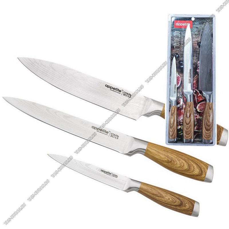 шеф-нож L20см/нож д/нарезки L19см/универсальный L11см),лезвие нержавеющая сталь 3Cr13,литая ручка с покрытием soft-touch "дерево/дамасская сталь",Appetite