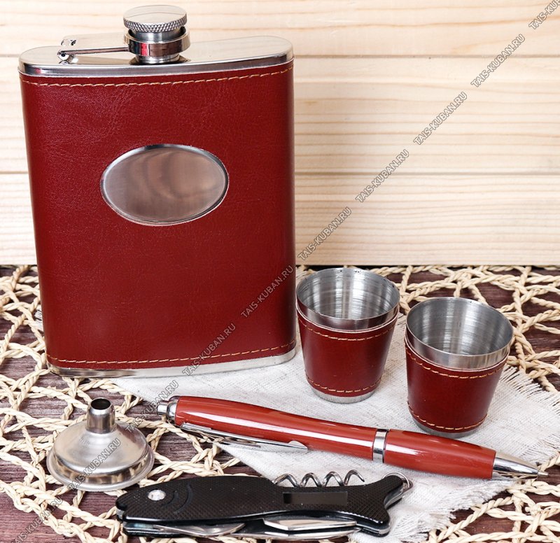 Фляжка 250мл, 2стопки, ручка,открывалка и воронка, металл+кожа, подарочная упаковка