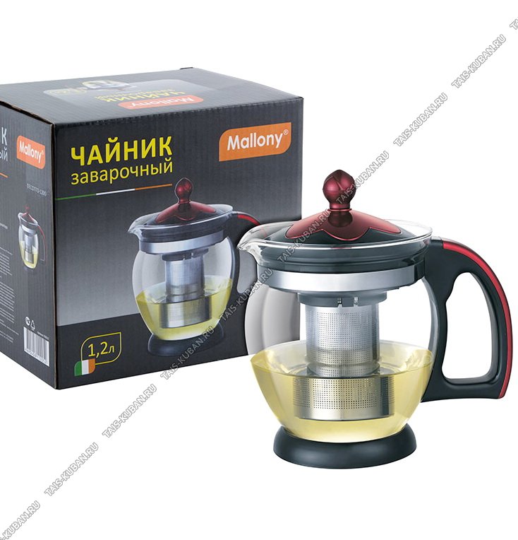 Чайник завар (стекло+пластик) "Decotto" 1,2л нерж.фильтр,черн/красн крышк,п/у (12)