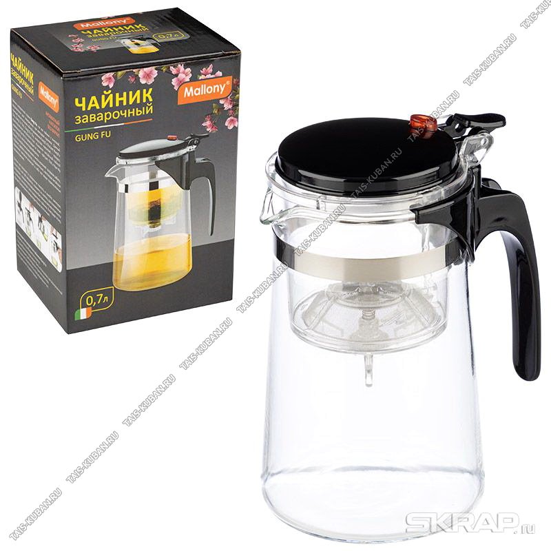 Чайник завар (стекло) "Gung" 0,8л крышк/руч.черн.пластик,кнопка д/откр.клапана д/слива чая,п/у (12)