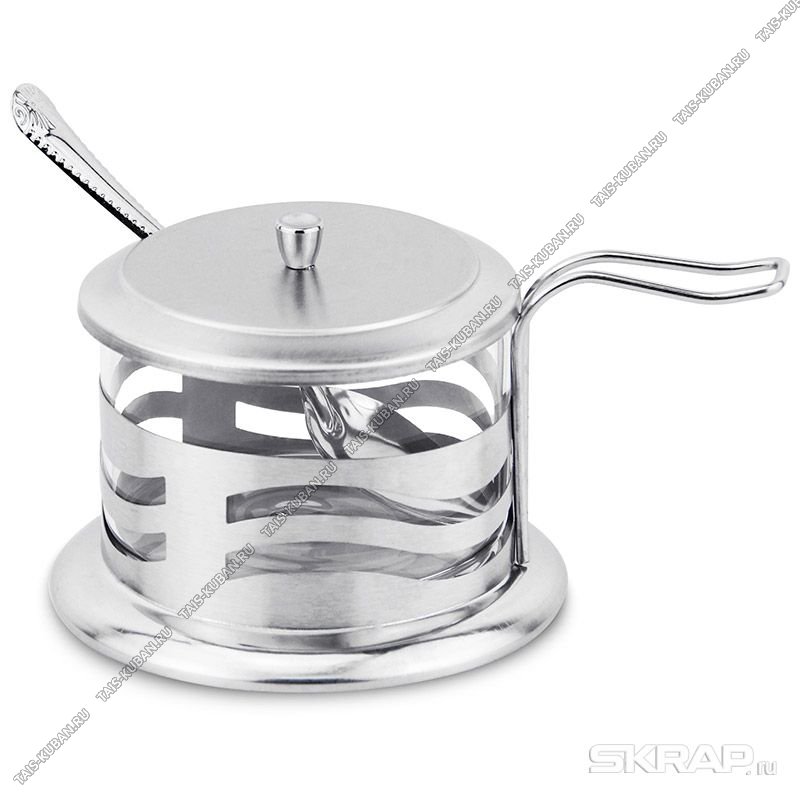 Сахарница 250мл (нерж+стекло) +ложка,нерж.крыш,подст-ка с ручк