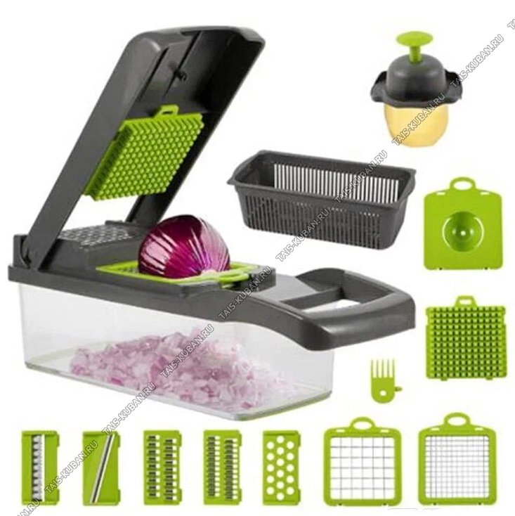 - дуршлаг для мытья и сушки овощей и фруктов- держатель для овощей (ваши руки защищены во время использования)- лезвия для нарезки (7 шт: соломка 2 мм, соломка 3 мм, ломтики/слайсер, волнитое лезвие, терка, кубики 6 мм, кубики 12 мм)- сепарратор для яиц- щеточка для чистки- контейнер для хранения лезвийС помощью мультитерки можно:- шинковать капусту для салата, делать тонкие пластины из картофеля или яблок для чипсов- натирать шоколад и орехи, готовить панировку- нарезать о