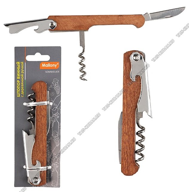 (штопор+открывалка для бутылок) нержавеющая сталь+дерево,блистер,Mallony
