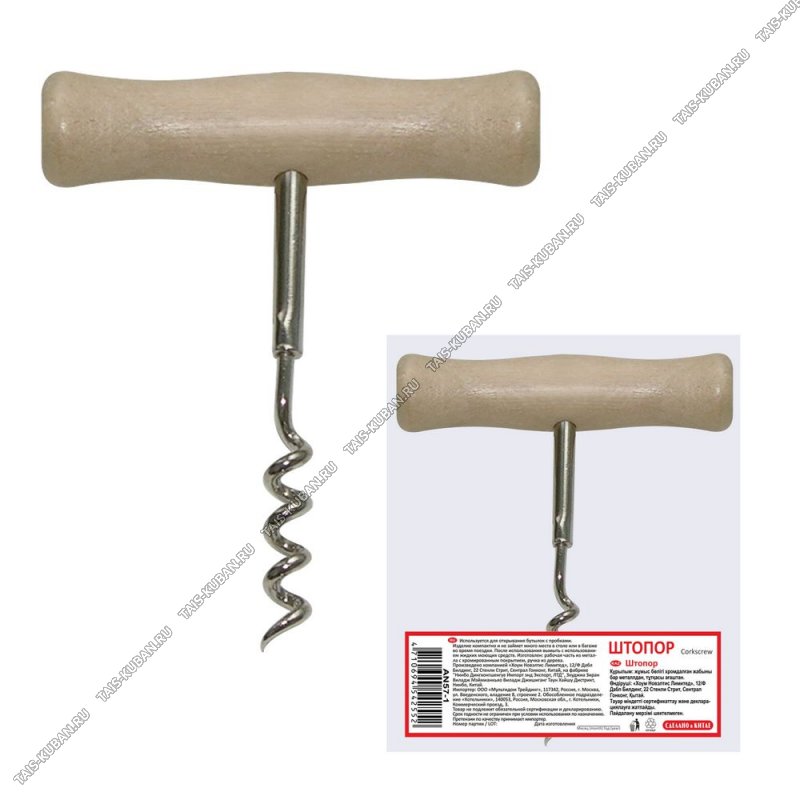 Штопор винтов L10см,нерж,дерев.руч,уп.пакет (30)