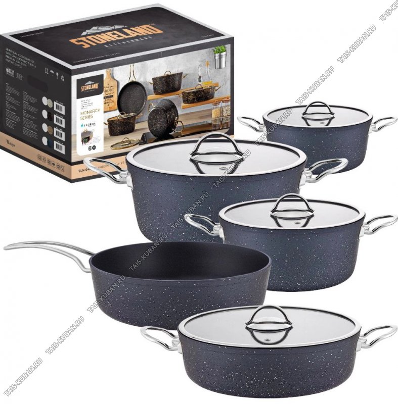 (кастрюли с крышками 2,5/4,5/6,5л d20/24/28 h10/11/12см,жаровня с крышкой 3,5л d28 h7,5см,сковорода 3,5л d28 h7,5см),толщина стенки 4мм,индукционное дно,стальные ручки,антипригарное покрытие Therna premium,подарочная упаковка