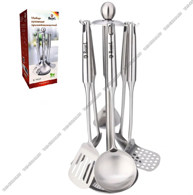 (шумовка L38,5 d12см,лопатка кухонная L37,5 10х10см,лопатка кухонная с прорезями L38 8х10см,ложка кулинарная L32 8х11см,половник L35,5 d10см,картофелемялка L35 8х8см) нержавеющая сталь,матовая полировка,цвет серебристый,подарочная упаковка,Rashel