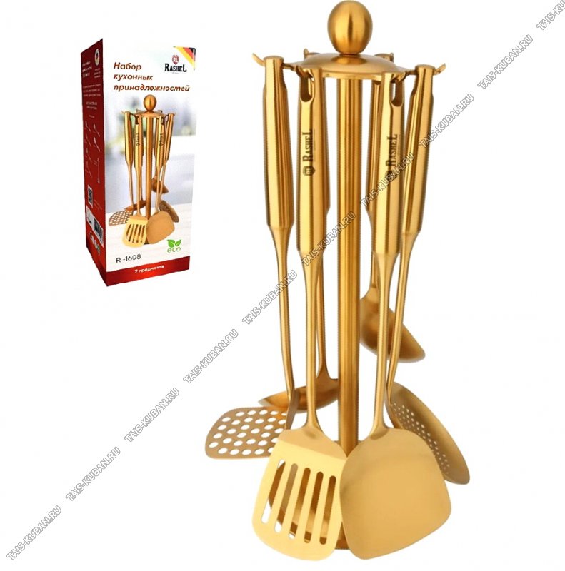 (шумовка L38,5 d12см,лопатка кухонная L37,5 10х10см,лопатка кухонная с прорезями L38 8х10см,ложка кулинарная L32 8х11см,половник L35,5 d10см,картофелемялка L35 8х8см) нержавеющая сталь,матовая полировка,цвет золото,подарочная упаковка,Rashel