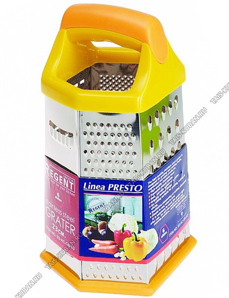 Терка 6-ти гран, h23см,нерж.сталь,пласт.ручк,прорезин.дно,желт-оранж (12) Терка 6-ти гран, h23см,нерж.сталь,пласт.ручк,прорезин.дно,желт-оранж (12)