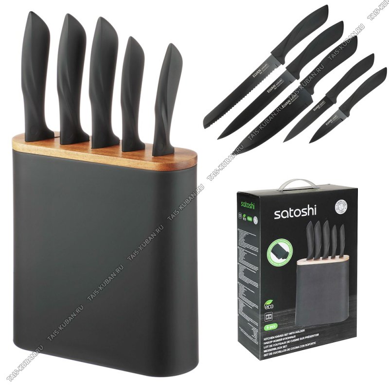на подставке (поварской 20/д/нарезки 20/д/хлеба 20/универсальный 13/д/овощей 9см) нержавеющее лезвие толщиной 1,5мм,черный,бакелитовая ручка с покрытием soft-touch,подарочная упаковка (6)