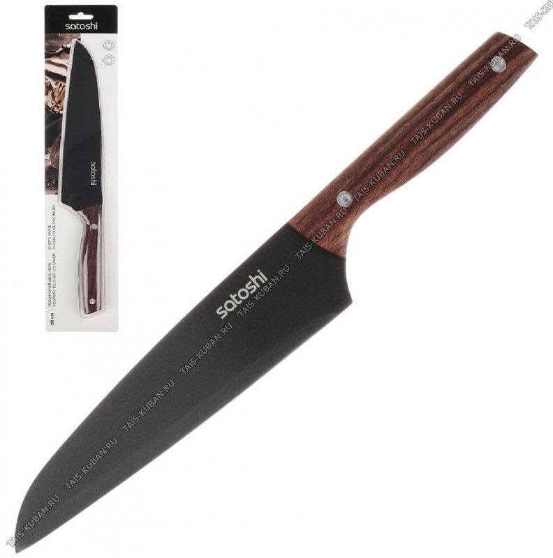 черное нержавеющее лезвие с антиналипающим покрытием,бакелитовая ручка "дерево",блистер,Satoshi