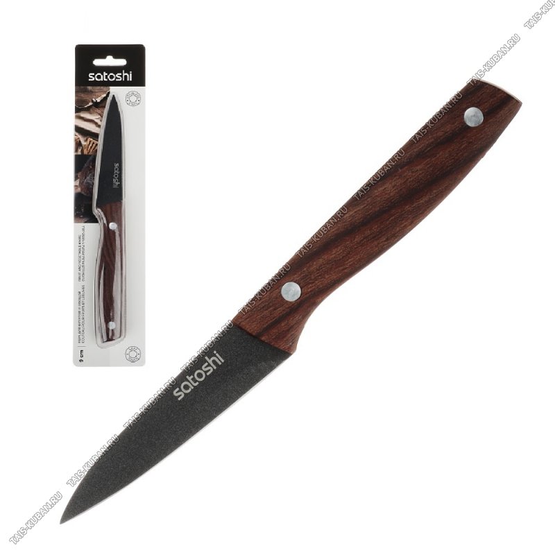 черное нержавеюще лезвие с антиналипающим покрытием,бакелитовая ручка "дерево",блистер,Satoshi