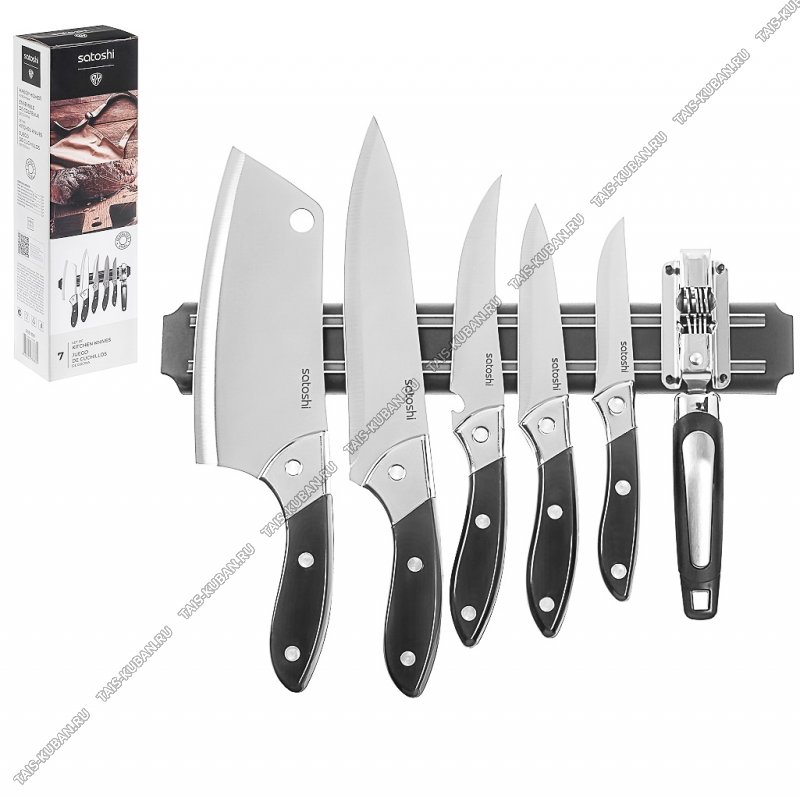 (шеф-нож 20см/топор 18см/универсальный 12,7 и 15см/для овощей 9см+точилка),черная ручка,подарочная упаковка,Satoshi