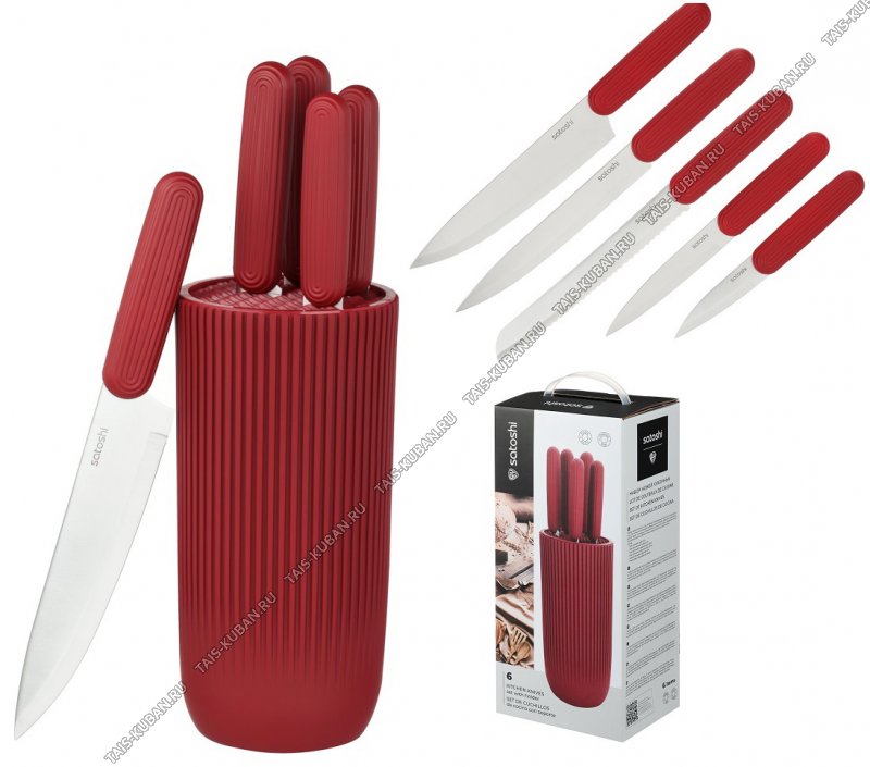 (шеф-нож 20см/д/хлеба 19см/универсальный 13 и 15см/д/овощей 9см) лезвие нержавеющая сталь3Cr13,пластиковая ручка,цвет красный,подарочная упаковка,Satoshi