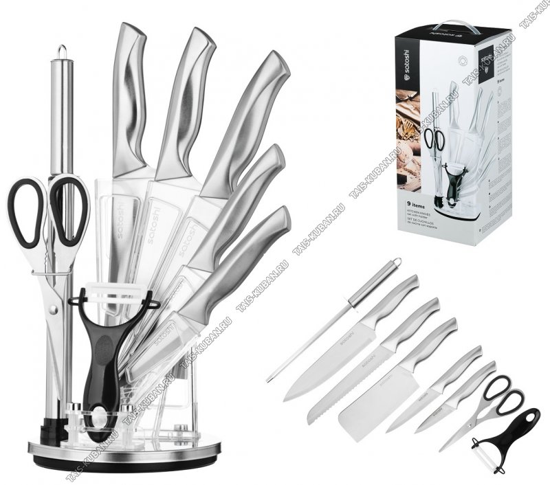 (шеф-нож 20см/д/хлеба 20см/универсальный 13см/д/овощей 9см/топорик L16,5см,мусат,ножницы,овощечистка поперечная) лезвие нержавеющая сталь 3CR13,пластиковая ручка,цвет серебристый,подарочная упаковка,Satoshi