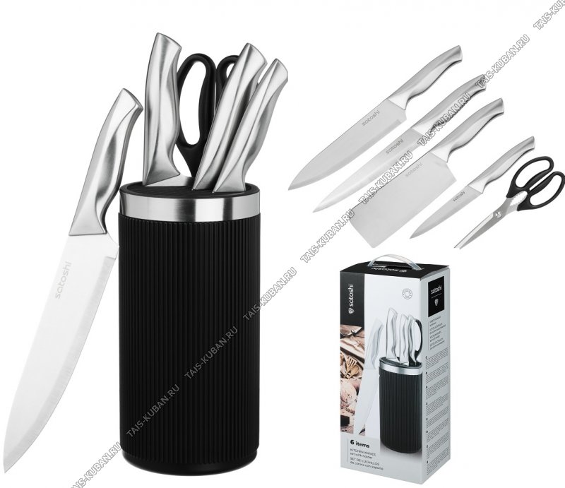 (шеф-нож 20см/д/хлеба 20см/универсальный 13см/топорик L16,5см,ножницы) лезвие нержавеющая сталь3Cr13,пластиковая ручка,цвет серебристый,подарочная упаковка,Satoshi