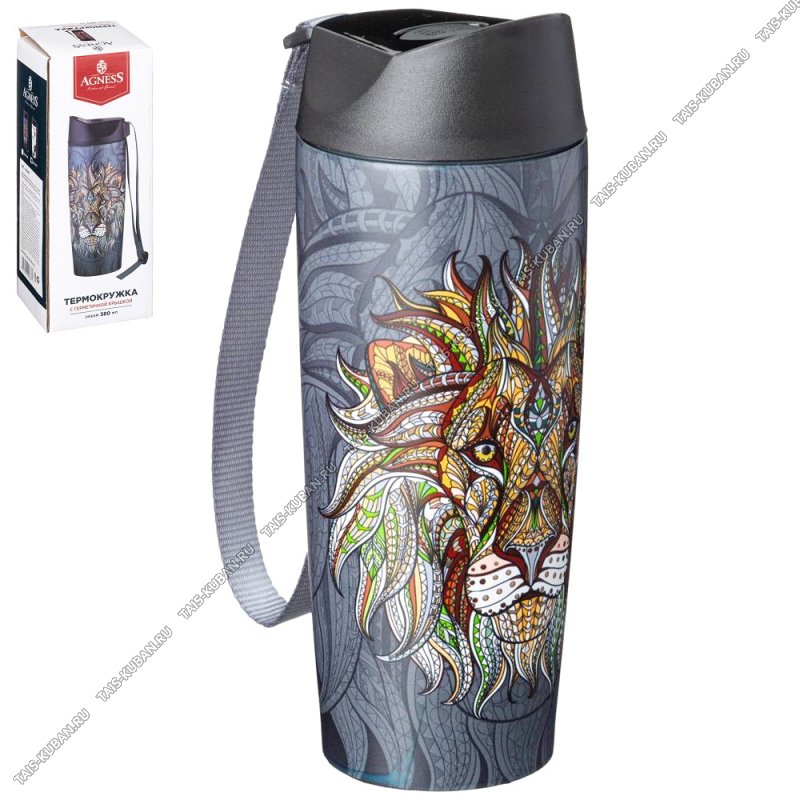 Термокружка (нерж) 0,36л "Agness/Лев" графит,крышка с кнопк-стоппер,ремешок,п/у (6)