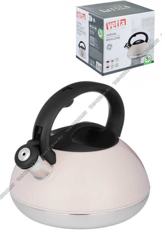 Чайник нерж 3,0л кремов,свист,индукц.капсул.дно,ручка бакел.черн.с кнопк.д/открыв,матов/зеркал.полоса,п/у (12)