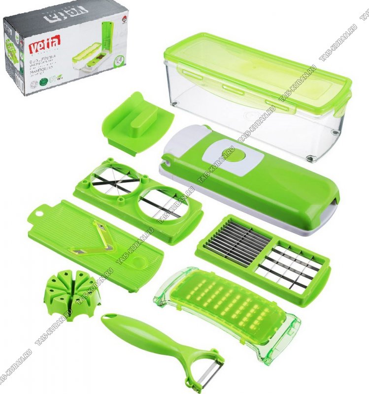контейнер пластиковый с крышкой,съёмная крышка с кнопкой д/очистки,овощечистка поперечная,терка с крышкой,насадки д/кубиков (мелкиий,средний,крупный),дольки 4 и 8частей,шинковка с держателем,протектор д/лезвий,подарочная упаковка,Vetta