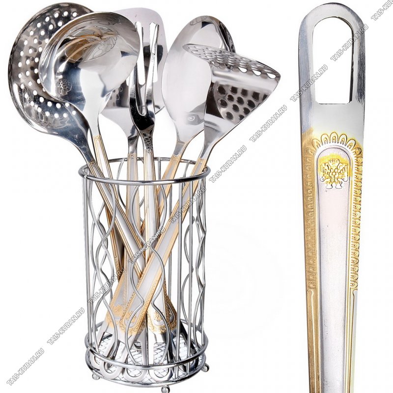(половник,шумовка,лопатка с прорезями,ложка поварская,картофелемялка,вилка) нержавеющая сталь,декор на ручке "золото",подарочная упаковка,Zeidan