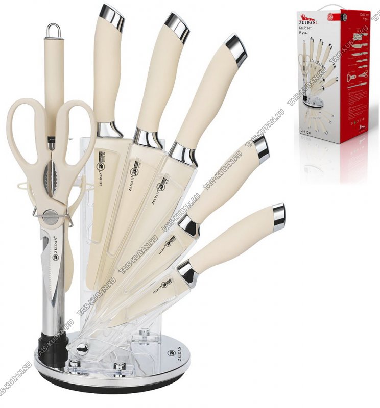 Набор ножей 8предметов на складной подставке (топорик 16,5/поварской 20/разделочный 20/универсальный 12,5/д/овощей 9см/мусат/ножницы/овощечистка поперечная) толщина лезвия 1,5мм,прорезиненная ручка,бежевый,подарочная упаковка (6)